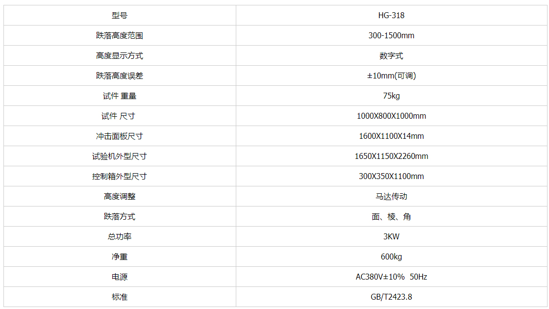 產(chǎn)品簡介:機(jī)械式跌落試驗(yàn)臺(tái)/跌落試驗(yàn)機(jī)主要適用于測試產(chǎn)品包裝后,受到墮落時(shí)受損情況,評(píng)估部件在搬運(yùn)過程中,遭受落下時(shí)其耐沖擊強(qiáng)度。包裝容器之菱、角、面均可測試。從而改進(jìn)、完美包裝設(shè)計(jì)。