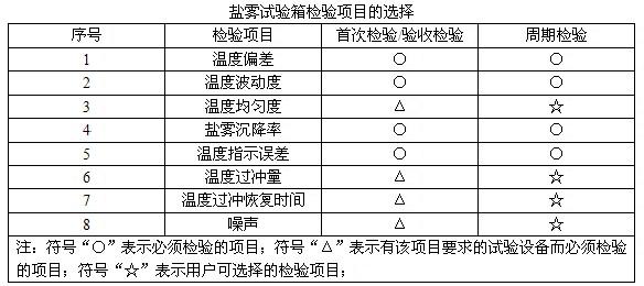 鹽霧試驗箱首次檢驗/驗收檢驗和周期檢驗時,若無其他規(guī)定,按下表選擇檢驗項目。