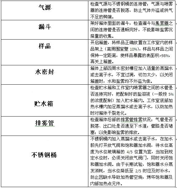 我們都知道,初次使用鹽霧試驗(yàn)箱有很多講究,更是要做好十足的準(zhǔn)備工作。那么,究竟在啟動鹽霧試驗(yàn)箱前我們要注意哪些事項(xiàng),如何做好充足的準(zhǔn)備?下表是小編整理的關(guān)于鹽霧試驗(yàn)箱啟動前需做的準(zhǔn)備工作,感興趣的朋友不妨一起來看看吧。