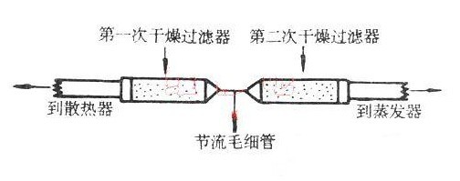 恒溫恒濕試驗箱制冷系統(tǒng)在檢修時,由于操作工藝不嚴(yán),往往會造成制冷系統(tǒng)中的水分不能處理干凈或系統(tǒng)中的空氣排不干凈。這些水分在恒溫恒濕試驗箱制冷系統(tǒng)中會與制冷劑、油反應(yīng)生成氫氟酸和鹽酸,腐蝕各部件、管道和冷凍油,尤其對鋁制平板式蒸發(fā)器腐蝕更嚴(yán)重。為了徹底解決這一問題,完全清除制冷系統(tǒng)中殘余水分,下面為大家介紹兩次過濾法,具體做法見下圖,在蒸發(fā)器與毛細(xì)管之間增加一個帶有干燥劑的過濾器。
