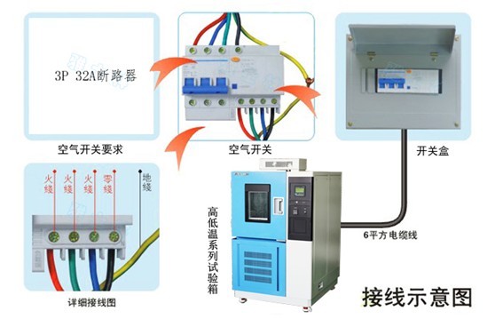 高低溫試驗(yàn)箱的電源要求是AC380V±10% 50±0.5Hz 三相五線制,并要求用戶在安裝現(xiàn)場為設(shè)備配置相應(yīng)容量的空氣或動(dòng)力開關(guān),并且此開關(guān)必須是獨(dú)立供本設(shè)備使用(建議電源開關(guān)容量:32A),其具體接線方式如下:
